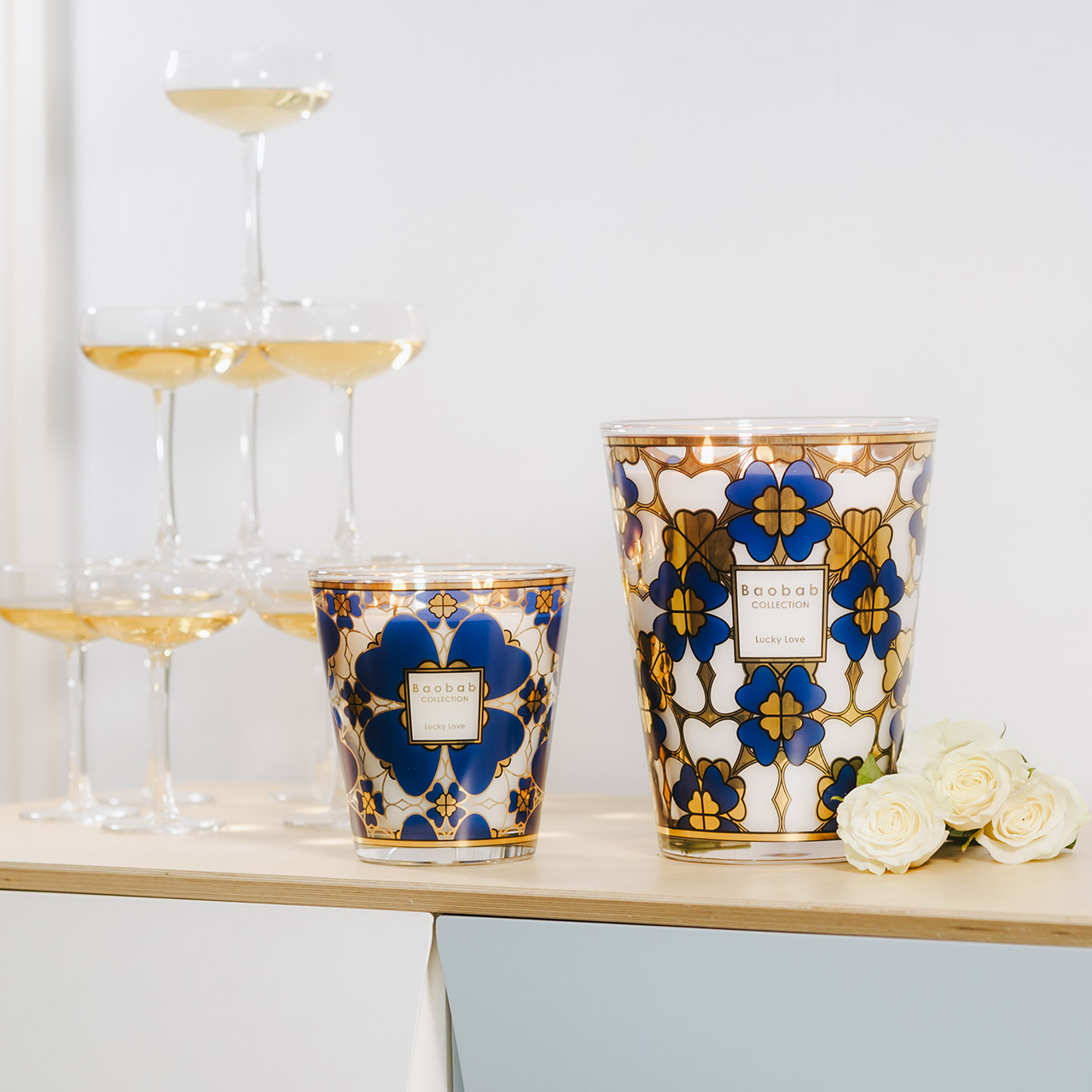 Das Design der Kerze Lucky Love findet seine Inspiration in einem Vintage-Schmuckstück aus den 60er-Jahren. Die Kerze präsentiert sich mit einem edlen Siebdruck in 24-Karat-Gold und Mitternachtsblau. Kleine Herzen bilden ein vierblättriges Kleeblatt.
