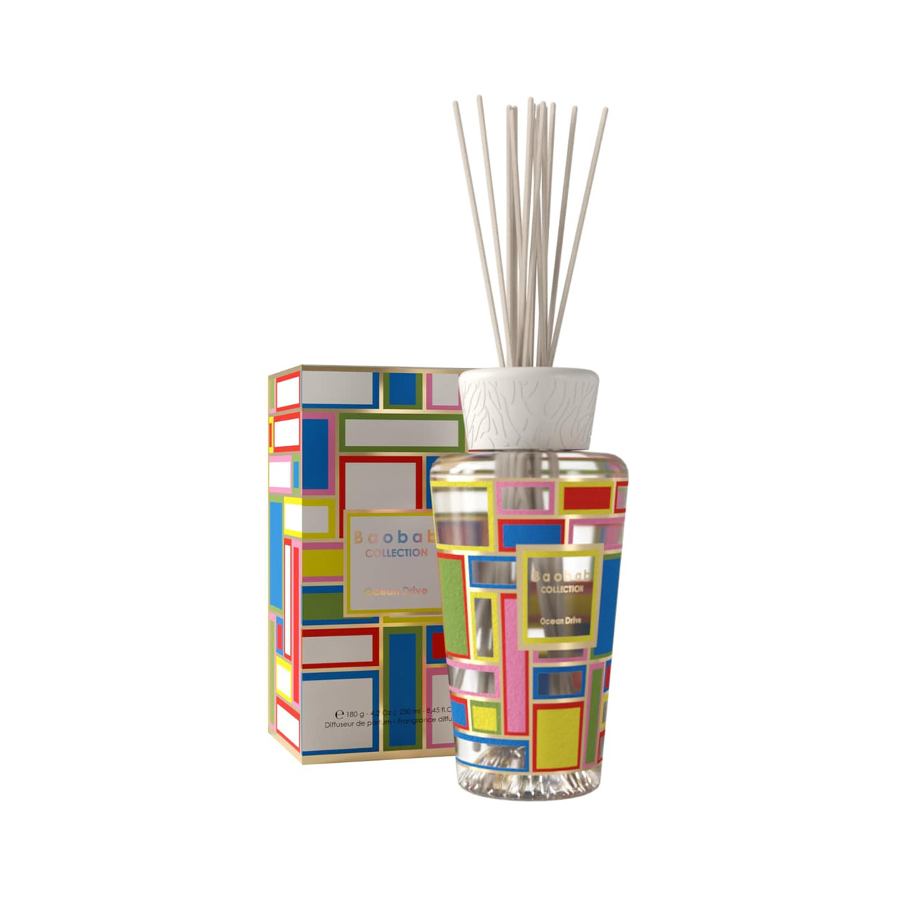 Der geschmackvolle, 15 cm hohe Diffuser Ocean Drive aus der Kollektion My First Baobab des belgischen Unternehmens Baobab zeigt sich in einem grafischen Siebdruckdekor als Hommage an die neonfarbenen Schaufenster am Ocean Drive in Miami. Das bunt abstrakte Design mit Gold-Elementen umschließt das mundgeblasene Glas, gekrönt wird der Flakon von einem weißen Bakelitverschluss mit eingraviertem Wurzelmuster. Der Diffuser kann 0,25 Liter fassen und hüllt jeden Raum in Duftnoten aus Mandarine, Yuzu und Zeder.