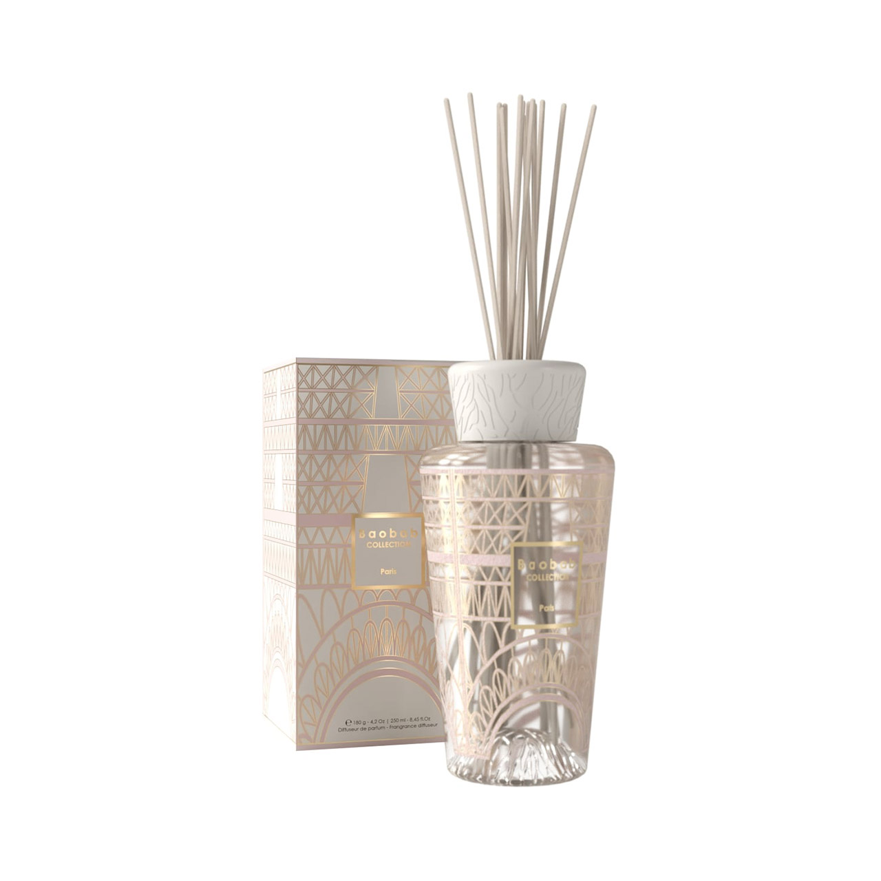 Der geschmackvolle, 15 cm hohe Diffuser Paris aus der Kollektion My First Baobab des belgischen Unternehmens Baobab zeigt sich in einem stilisierten Siebdruckdekor als Hommage an die Struktur des Eifelturms in Paris. Das zartrosafarbene Design mit Gold-Elementen umschließt das mundgeblasene Glas, gekrönt wird der Flakon von einem weißen Bakelitverschluss mit eingraviertem Wurzelmuster. Der Diffuser kann 0,25 Liter fassen und hüllt jeden Raum in Duftnoten aus Linde, Glyzinie undd Mimose.