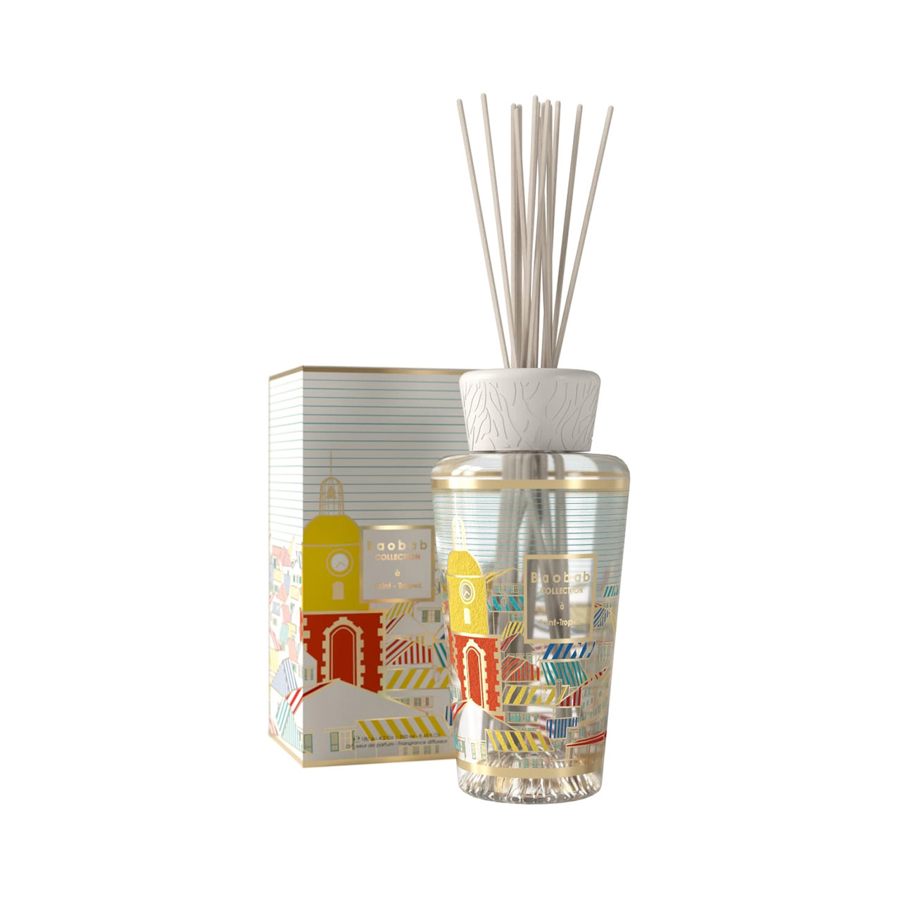 Der geschmackvolle, 15 cm hohe Diffuser Saint Tropez aus der Kollektion My First Baobab des belgischen Unternehmens Baobab zeigt sich in einem Dekor als Hommage an die Dächer der Dorfhäuser und den mythischen Glockenturm in Saint Tropez. Der Glas-Flakon zeigt sich in einem bunten Design mit Gold-Elementen und wird von einem weißen Bakelitverschluss mit eingraviertem Wurzelmuster gekrönt. Der Diffuser kann 0,25 Liter fassen und hüllt jeden Raum in Duftnoten aus Thymian, Minze und Basilikum.