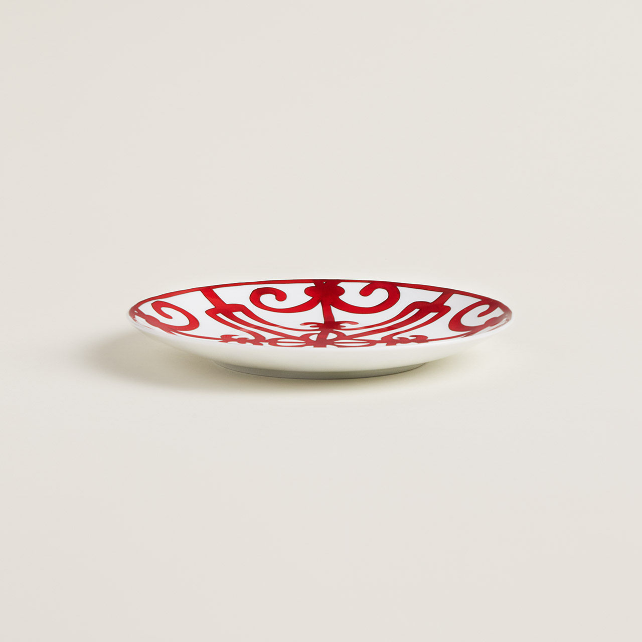 Das leuchtende Rot von Balcons du Guadalquivir symbolisiert das Eisen, aus dem die Balkone der andalusischen Häuser entlang des Flusses Guadalquivir geschmiedet wurden. Unterschiedliche, strahlende Rottöne geben die fast spitzenartigen Dekorationen der Balkone wieder. Dieses Service von Hermès ist besonders umfangreich und kann mit zahlreichen weiteren Produkten kombiniert werden – von verschiedenen Tellern und Platten, über Schüsseln, bis hin zu Vasen.