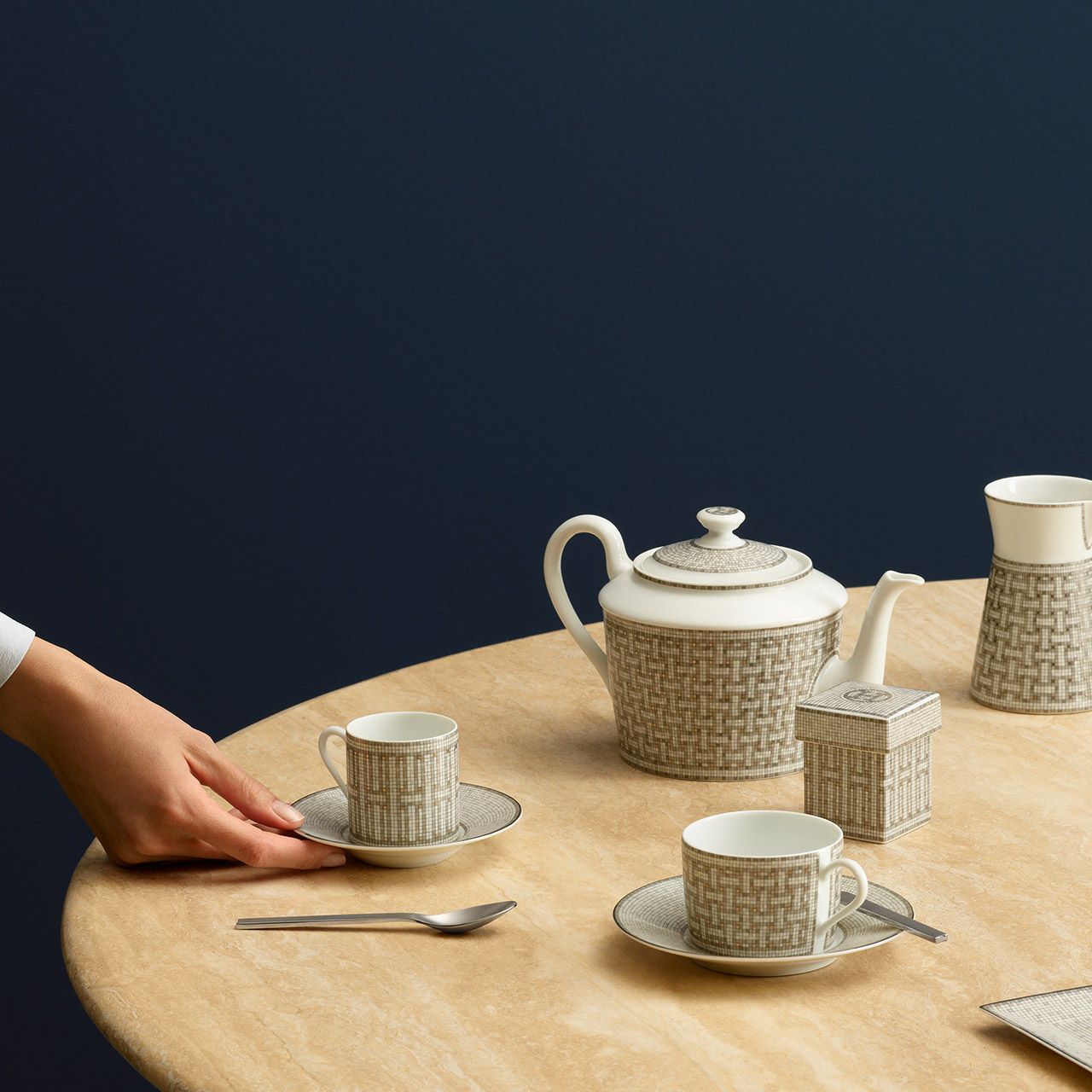 Die Art Déco Mosaike im Boden des Pariser Stammhauses von Hermès gaben die Anregungen für dieses Dekor. Zarte Grautöne werden mit Platinplättchen veredelt; ein stilisiertes H oder das Wappen in der Mitte vervollständigen das schlichte, elegante Motiv. Zum Service gehören zahlreiche Produkte, von verschieden großen Tellern, Platten und Schüsseln, bis hin zu einem Milchgießer und einer Teekanne.