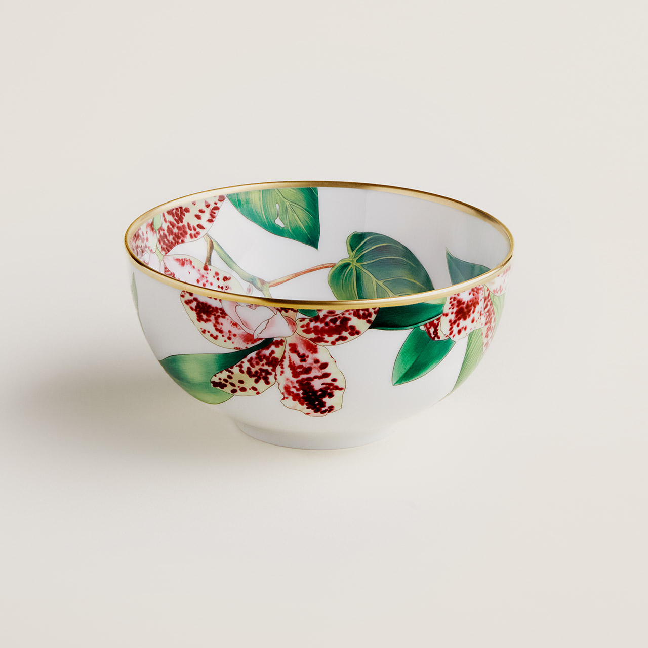Die Serie Passifolia vom französischen Traditionsunternehmen Hermès entführt in eine exotische Welt voller außergewöhnlicher, tropischer Pflanzen des Dschungels. Den weißen Untergrund des hochwertigen Limoges-Porzellans verzieren tropische Blätter in unterschiedlichen Grüntönen, von Menthol- und Salbei- bis hin zu Seladon-Grün. Mit einem Durchmesser von 12 cm und einem Fassungsvermögen von 0,40 Liter präsentiert die mittelgroße Schale das tropische Dessin auf ihrer Außen- und Innenseite. Der Goldrand verleiht ihr zusätzlich eine edle und exklusive Note. Für eine ausgiebige Exkursion in die prachtvolle Pflanzenwelt kann die Schale mit weiteren Teilen der Kollektion kombiniert werden.