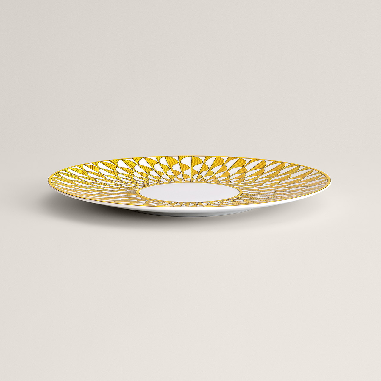 Soleil d’Hermès ist eine Ode an warme Sommertage, das Spiel aus Licht und Schatten und die Kraft der Sonne. Das Design der Kollektion strahlt durch nuancierte Gelbtöne sowie zarte, schwarze Konturlinien und Schattierungen – Rundung und Abstraktion verleihen dem feinen, spülmaschinenfesten und mikrowellengeeigneten, weißen Porzellan Strahl- und Aussagekraft. Der Speiseteller hat einen Durchmesser von 27 cm und erinnert mit seinem ausdrucksstarken, stromlinienförmigen Design an dynamisch stilisierte Federn. Für gesellige Stunden und eine harmonisch sonnendurchflutete Tafel lässt sich der Teller mit weiteren Teilen der 24-teiligen Kollektion kombinieren.