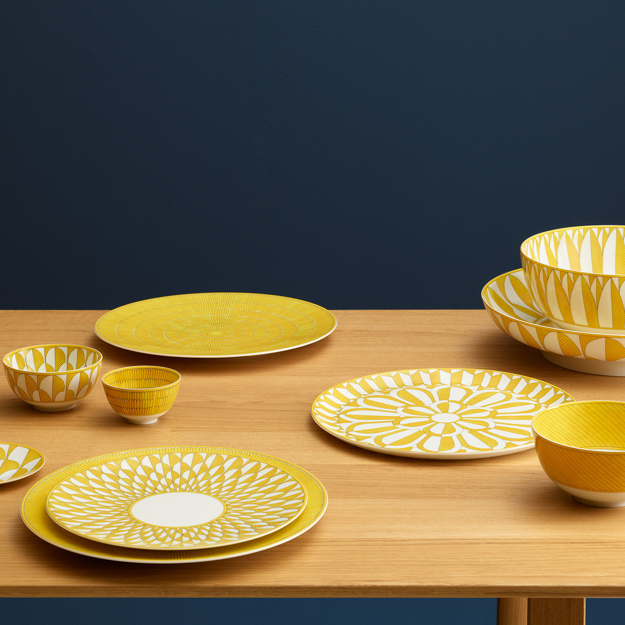 Soleil d’Hermès ist eine Ode an warme Sommertage, das Spiel aus Licht und Schatten und die Kraft der Sonne. Das Design der Kollektion strahlt durch nuancierte Gelbtöne sowie zarte, schwarze Konturlinien und Schattierungen – Rundung und Abstraktion verleihen dem feinen, spülmaschinenfesten und mikrowellengeeigneten, weißen Porzellan Strahl- und Aussagekraft. Der Suppenteller hat einen Durchmesser von 21 cm und erinnert mit seinem ausdrucksstarken, stromlinienförmigen Design an dynamisch stilisierte Federn. Für gesellige Stunden und eine harmonisch sonnendurchflutete Tafel lässt sich der Teller mit weiteren Teilen der 24-teiligen Kollektion kombinieren.